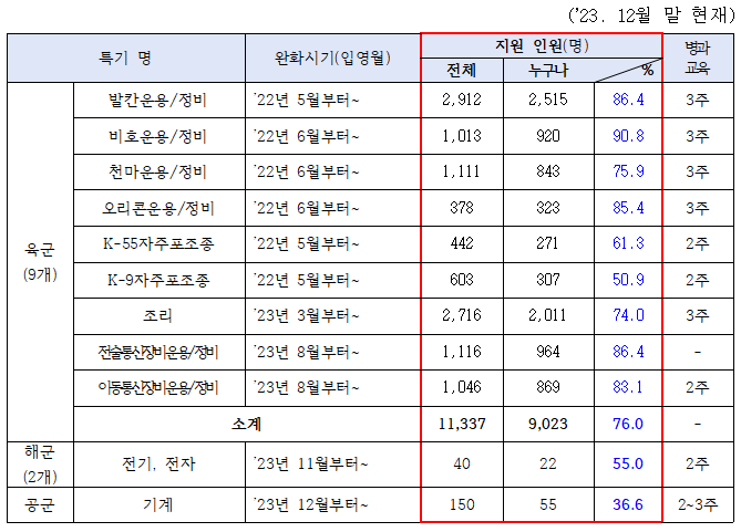 - ’23년에 12개 특기 지원자격 완화, 11,527명의 78.9%인 9,100명 지원