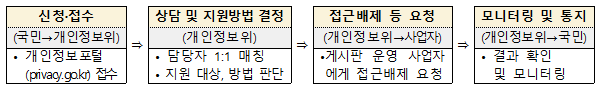 | 신청자격 : 30세 미만 국민 누구나 지원대상 : 19세 미만 아동·청소년 시기에 본인이 온라인에 게시한 글·사진·영상 등 개인정보를 포함하고 있는 게시물 지원내용 : 해당 게시물의 접근배제(삭제, 블라인드 등) 신청·상담 신청방법 : 개인정보 포털 > 개인서비스 > 지우개(잊힐권리) 서비스 게시판(privacy.go.kr/delete.do)에서 자기게시물 입증자료 등을 첨부하여 신청 이용절차 : 총 4개 단계로 나누어 제공 ![]() |