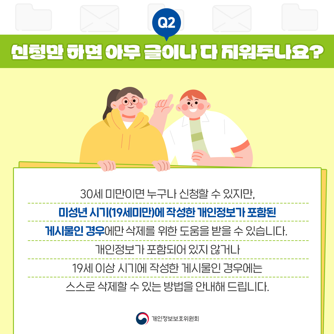 | Q1. 지우개 서비스란? 지켜야할 우리들의 개인정보를 말합니다. 지우개 서비스는 아동·청소년 시기에 작성한 게시물 중 개인정보가 포함되어 있는 게시물에 대해 삭제되도록 하거나 다른 사람이 검색하지 못하도록 도와주어 우리들의 소중한 개인정보를 지켜주는 서비스입니다. Q2. 신청자격이 있나요? 30세 미만이면 누구나 신청할 수 있습니다. 더 많은 분들이 지우개 서비스를 이용할 수 있도록 신청인 연령기준을 24세 이하에서 30세 미만으로 확대했습니다. Q3. 30세 미만의 신청자가 신청하면 아무 글이나 다 지워준다는 거죠? 30세 미만이면 누구나 신청할 수 있지만, 미성년 시기(19세미만)에 작성한 개인정보가 포함된 게시물인 경우에만 삭제를 위한 도움을 받을 수 있습니다. 개인정보가 포함되어 있지 않거나 19세 이상 시기에 작성한 게시물인 경우에는 스스로 삭제할 수 있는 방법을 안내해 드립니다. Q4. 개인정보를 포함한 게시물이 어떤 건지 잘 모르겠어요. 이름, 생년월일, 전화번호, 주소, 사진 등 특정개인을 알아볼 수 있는 정보를 포함하고 있는 게시물을 말합니다. Q5. 게시물을 삭제하는 것과 검색되지 않게 하는 것은 다른 건가요? 우리가 온라인 공간에 남긴 글은 처음 게시물을 올린 공간(게시판 등)은 물론이고 검색포털에서 검색결과로도 나타날 수 있습니다. 그래서 지우개 서비스가 어떤 도움을 주길 원하는지 ‘게시물을 삭제해 주세요’, ‘게시물이 검색되지 않게 해 주세요’, ‘상담이 필요해요’ 등을 구체적으로 요청하여야 합니다. 복수선택도 가능합니다. Q6. 어떤 처리 절차를 거치는지도 궁금해요! 신청이 완료되면 지우개 서비스 담당자는 신청내용을 확인한 후 해당 게시물의 게시판 관리자 등에게 삭제(또는 검색이 되지 않게 조치)를 요청합니다. 이 과정에서 지우개 서비스 담당자와 게시판 관리자는 지우개 서비스를 신청한 사람(신청자)에게 입증자료를 보완해 달라고 요청할 수 있습니다. 처리가 완료되면 신청자에게 결과를 알려드립니다. |