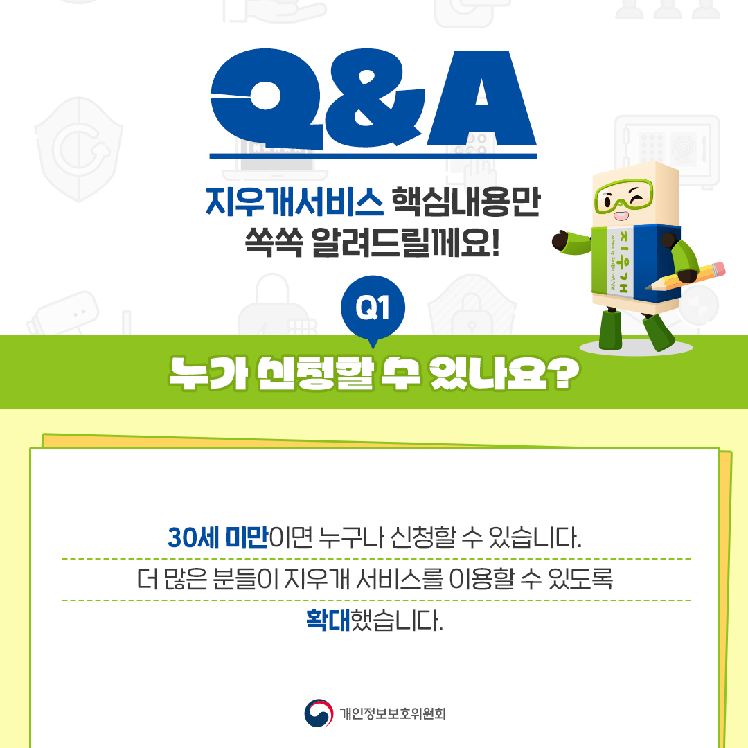 4월 30일까지 지우개서비스 시행 1년간 신청접수건이 17,148건(처리 16,518건)에 이른다. 개인정보위는 더욱더 많은 이용자에게 알릴 수 있도록 서비스 관련 주요 Q&A를 아래와 같이 만들어 개인정보위 SNS를 통해서도 안내하고 있다.