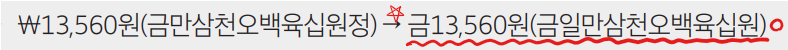 * 금액: 금액을 표시할 때 아라비아 숫자로 쓰되, 숫자 다음에 괄호를 하고 한글로 금액을 풀어써줍니다.