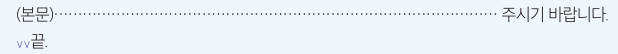 * 본문 또는 붙임 표시문이 오른쪽 끝에 닿아서 끝나는 경우는 그다음 줄의 왼쪽 시작선에서 한 글자(2타) 띄우고 '끝.'을 적습니다.