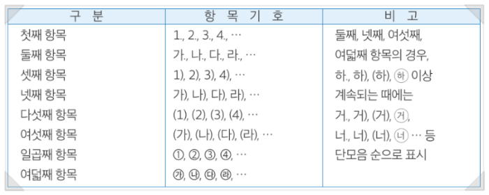 공문서에 작성할 항목이 둘 이상이거나, 하나의 항목 안에 또 다른 항목들이 필요하다면, 아래 이미지에 안내된 순서대로 항목 기호를 붙이면 됩니다. 필요한 경우에는 □, ○, ―, • 등과 같은 특수한 기호를 사용할 수도 있습니다.