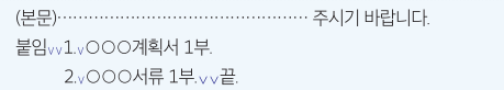 * 문서에 첨부물이 있는 경우, 본문이 끝난 줄 다음에 '붙임' 표시를 하고, 첨부물의 명칭과 수량을 씁니다. 첨부물이 두 가지 이상인 경우 항목을 구분하여 적어줍니다.