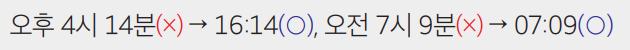 * 시간은 24시각제에 따라 숫자로 표시하되, 시, 분은 쓰지 않고 그 사이에 쌍점(:)을 찍어 구분합니다.
