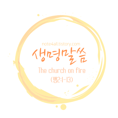 [행 2:1-13] 1 오순절 날이 이미 이르매 그들이 다같이 한 곳에 모였더니 2 홀연히 하늘로부터 급하고 강한 바람 같은 소리가 있어 그들이 앉은 온 집에 가득하며 3 마치 불의 혀처럼 갈라지는 것들이 그들에게 보여 각 사람 위에 하나씩 임하여 있더니 4 그들이 다 성령의 충만함을 받고 성령이 말하게 하심을 따라 다른 언어들로 말하기를 시작하니라 5 그 때에 경건한 유대인들이 천하 각국으로부터 와서 예루살렘에 머물러 있더니 6 이 소리가 나매 큰 무리가 모여 각각 자기의 방언으로 제자들이 말하는 것을 듣고 소동하여 7 다 놀라 신기하게 여겨 이르되 보라 이 말하는 사람들이 다 갈릴리 사람이 아니냐 8 우리가 우리 각 사람이 난 곳 방언으로 듣게 되는 것이 어찌 됨이냐 9 우리는 바대인과 메대인과 엘람인과 또 메소보다미아, 유대와 갑바도기아, 본도와 아시아, 10 브루기아와 밤빌리아, 애굽과 및 구레네에 가까운 리비야 여러 지방에 사는 사람들과 로마로부터 온 나그네 곧 유대인과 유대교에 들어온 사람들과 11 그레데인과 아라비아인들이라 우리가 다 우리의 각 언어로 하나님의 큰 일을 말함을 듣는도다 하고 12 다 놀라며 당황하여 서로 이르되 이 어찌 된 일이냐 하며 13 또 어떤 이들은 조롱하여 이르되 그들이 새 술에 취하였다 하더라
