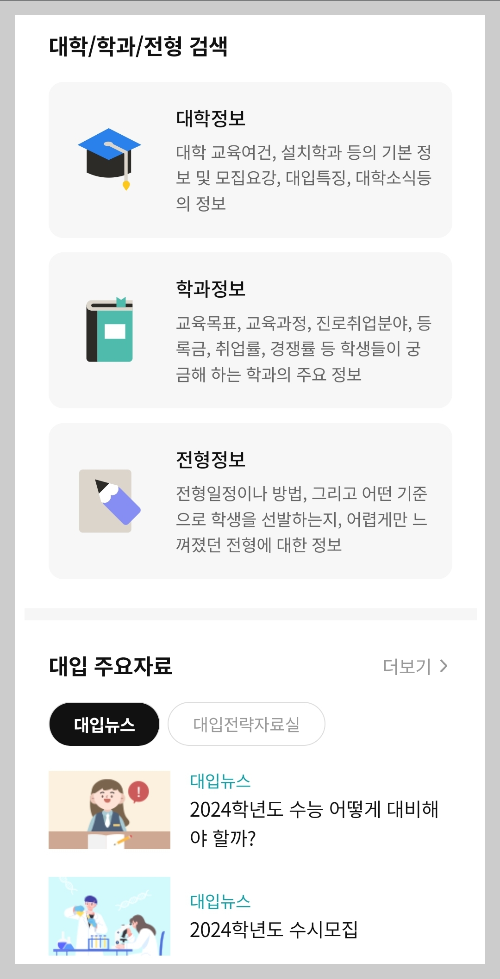 - 모바일 웹페이지 제공, 내신·모의고사 성적 자동 입력, 사용자 맞춤형 입시 자료 제공 등 수험생 편의성 확대