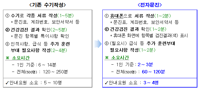 ◦ 먼저, 입소절차 간소화로 기존 손으로 작성할 때보다 △입소 소요시간은 개인기준 약 4~11분, 전체 입소인원(500명) 기준 약 1시간 이상을 줄였고, △입소안내에 필요한 병력* 중 일부를 훈련준비 요원으로 활용하여 훈련준비 여건도 좋아졌습니다.